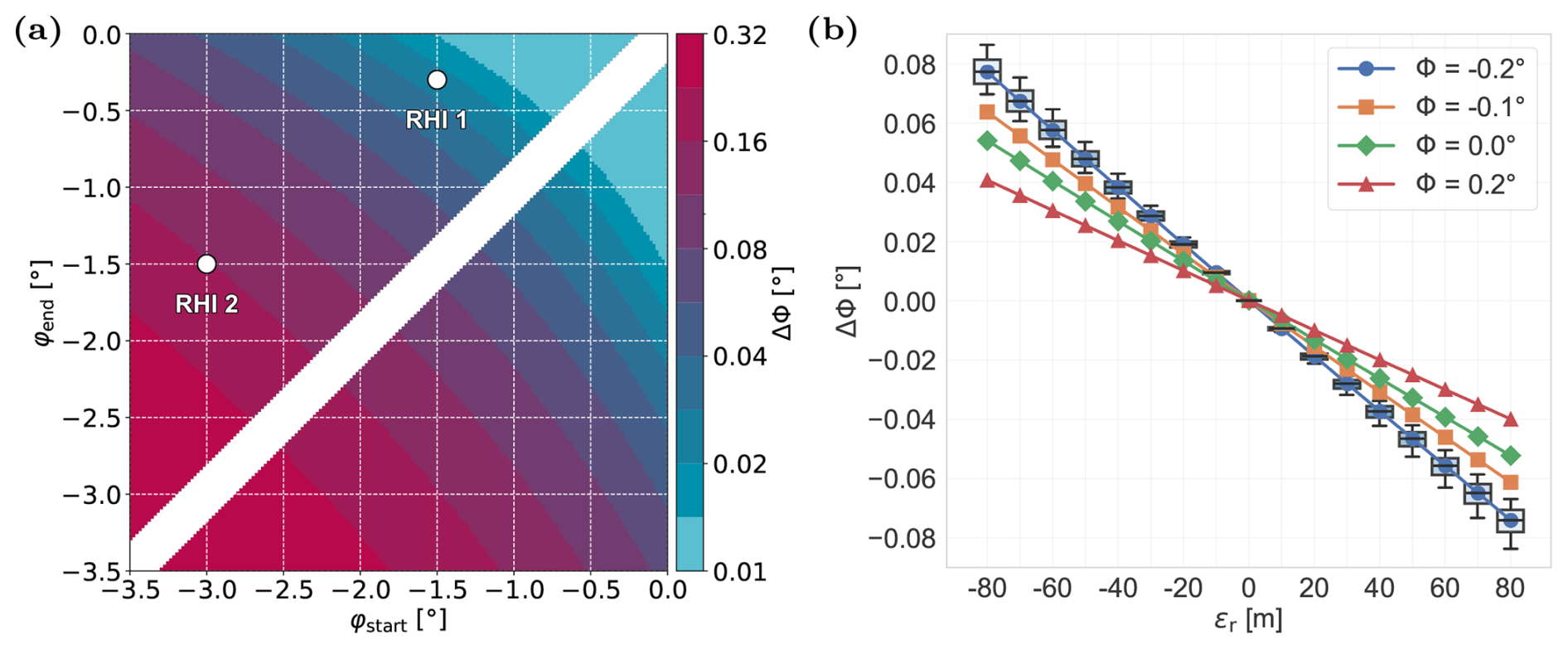 Figure 6Modelling results of the elevation offset ΔΦ depending on ϵr based on RHI scan settings (step size of 0.02° for φ and 5° for θ, with hlidar=20 m). Panel (a) shows the impact of the elevation angle interval on ΔΦ for ϵr=37.5 m. φstart and φend are the start and end values for the interval of φ used in the SSL evaluation. White areas denote NaN (Not a Number) values, where the interval between φstart and φend is too small to yield meaningful results. Panel (b) shows the median value of ΔΦ from the simulation due to varying ϵr for different Φ values (different coloured lines) using a fixed interval from ° to ° (RHI 1 settings). Boxplots show the effect on ΔΦ for α,β varying by ±0.2° and hlidar varying by 18–22 m for °.