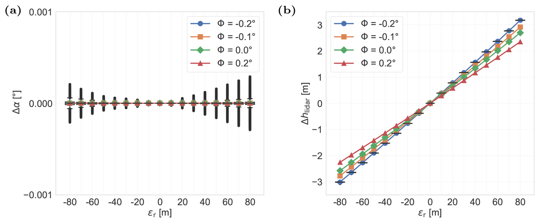 Unlike the results for ΔΦ, Fig. 7a shows that simulated ϵr values have minimal impact on pitch or roll angle deviations (the results for roll angle are not shown due to their similarity). The simulation clearly indicates that uncertainties in pitch induced by ϵr remain well below 0.001° and can therefore be considered to be negligible. However, ϵr has a noticeable influence on the derived hlidar (Fig. 7b), which can lead to deviations of up to ±3 m for ϵr of ±80 m. The lidar height above sea level is generally not the focus of the SSL analysis, but it must be determined as an indirect variable in Eq. (13).