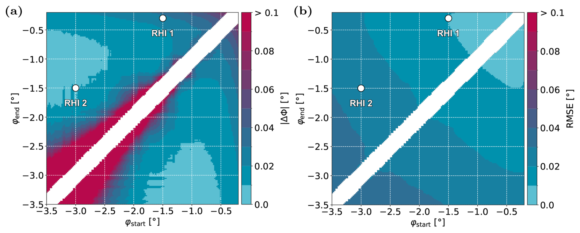 Figure 8Influence of waves on ΔΦ, determined via SSL as a function of the elevation interval based on RHI settings, azimuth angle steps of 10°, and elevation interval steps of 0.02°. Waves with Hs=1 m and λ=25 m are considered. Panel (a) shows the magnitude of ΔΦ resulting from the influence of the simulated waves, while panel (b) shows the influence of waves for the RMSE of φL in the model fit.