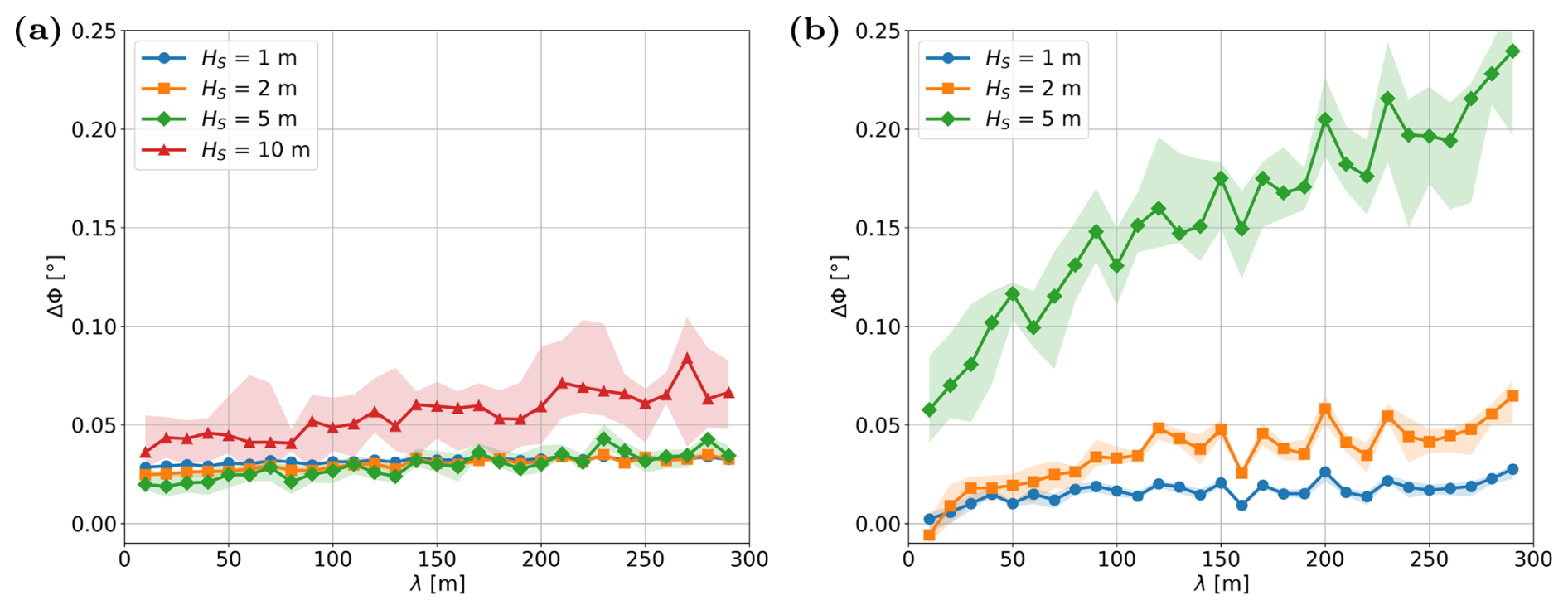 In the RHI 1 configuration, the influence of waves on ΔΦ remains minimal at Hs values of 1, 2, and 5 m, with deviations below 0.04°. In contrast, the effect becomes pronounced at Hs=10 m, which corresponds to wave amplitudes typical of very stormy and extreme sea conditions, with maximum deviations reaching up to 0.1°. It should be noted that SSL measurements should generally not be conducted under such extreme conditions, where high waves, strong winds, or turbine operation could induce platform tilting and other effects associated with high sea states. For small wave heights and short wavelengths, RHI 2 exhibits similar or even lower values than RHI 1. Notably, at RHI 2, with Hs=2 m and very short wavelengths, ΔΦ occasionally becomes negative. For longer wavelengths at small wave heights of Hs=2 m, however, the influence of the waves can reach approximately 0.05° and should therefore be considered in the uncertainty quantification for the RHI 2 setting. Furthermore, at Hs=5 m and λ=125 m (corresponding to a wave steepness of 0.04), ΔΦ reaches 0.15°. At Hs=10 m in the RHI 2 configuration (not shown in the graph), ΔΦ ranges between 0.4 and 0.6°, suggesting that a reliable estimate of Φ under stormy conditions due to the resulting inaccurate determination of rw due to high wave amplitudes is associated with very high uncertainties.
