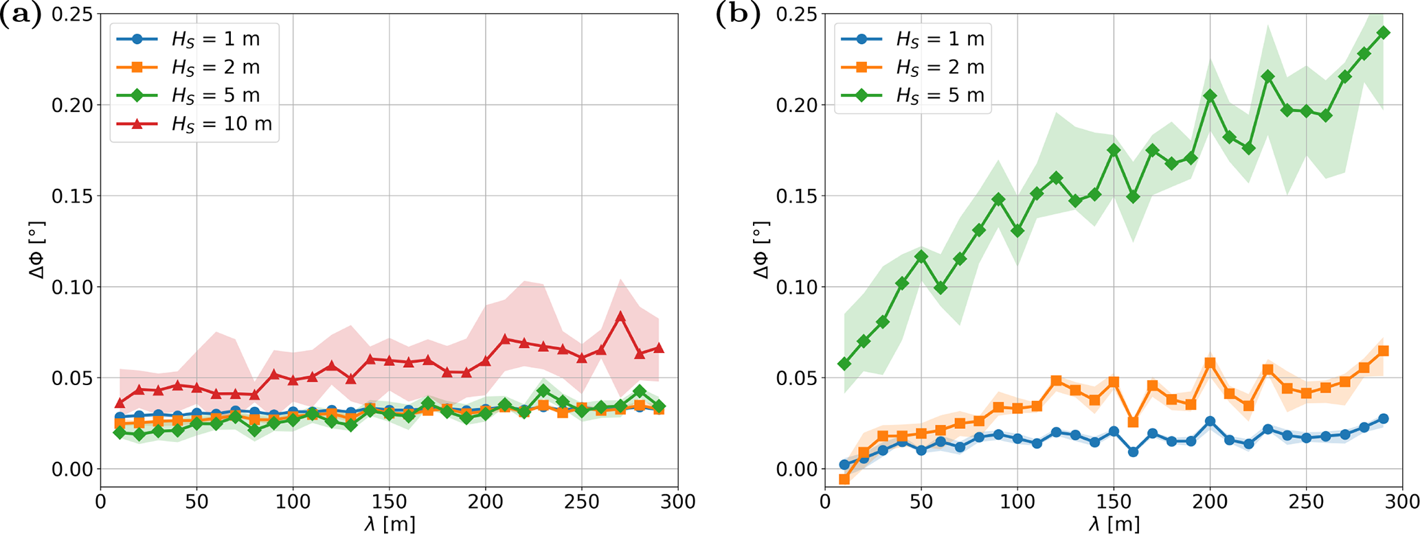 Figure 9Illustration of ΔΦ as a function of different λ values based on a set of 10 random Rayleigh distributions for different HS. The solid line indicates the median of the 10 distributions, and the shaded area represents the 10th–90th percentile range. Panel (a) shows results for the RHI 1 setting, and panel (b) shows results for the RHI 2 setting. In (b), results for HS=10 m are not shown as the scale has been kept comparable to that of (a) to facilitate direct comparison.
