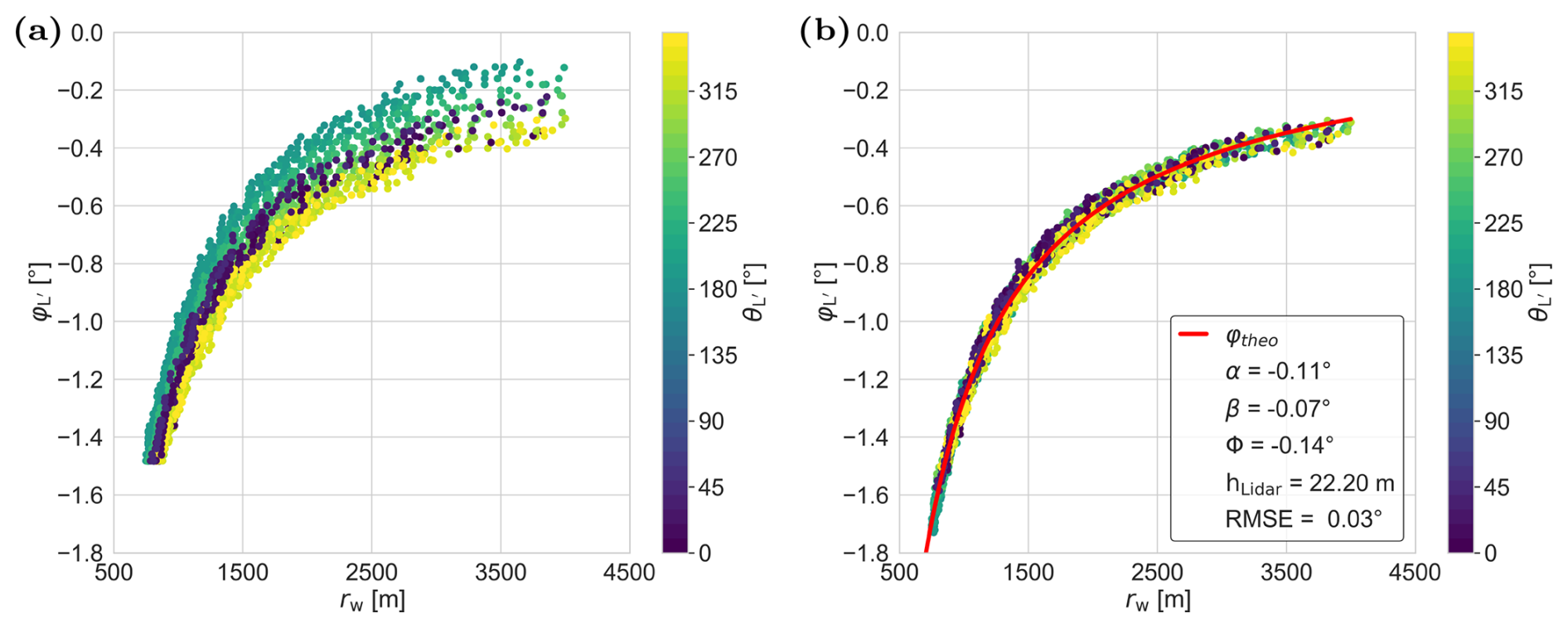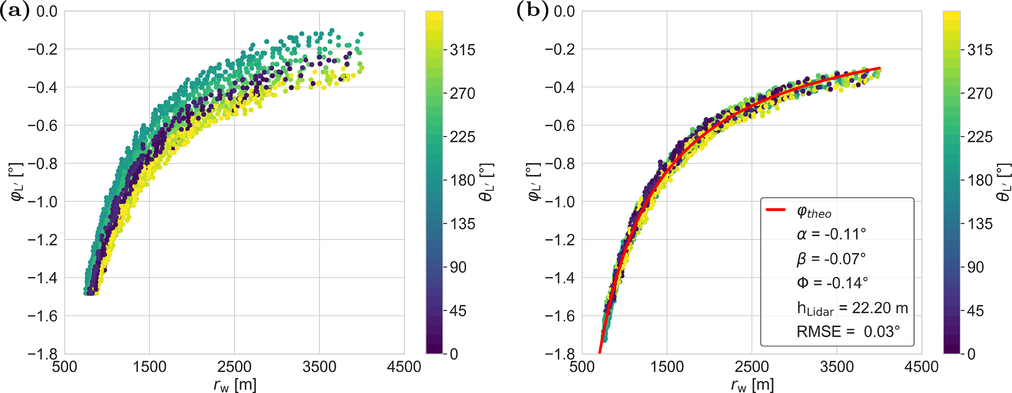 Figure 10The dependence of on the rw of an SSL measurement is shown using RHI 1 data. The colour scale represents different values. Panel (a) shows the measured rw compared to the internal lidar data. Based on these values, the Eq. (13) is determined by optimising the parameters for α, β, Φ, and hlidar. Panel (b) shows that the data are corrected by taking into account the calculated tilt. The red line φtheo represents the model prediction based on the optimised parameters. The deviation between the measured values and the model curve is used to calculate the RMSE.