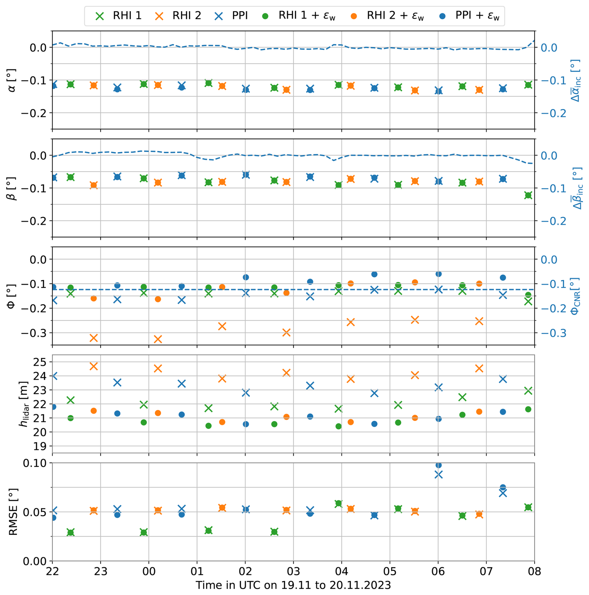 Figure 11Evaluation of repetitive SSL scans using different patterns. Green RHI 1 (° to °; step: 0.02°), orange RHI 2 (° to °; step: 0.02°), and blue PPI ( to °; step: 0.5°). Crosses: uncorrected; points: rw-corrected ( m, half probe length). Shown: α, β, Φ, hlidar, and RMSE for 19–20 November 2023 under conditions of low wind and minimal platform motion. The right axes and dashed line display an external reference measurement; the first two panels show the deviations of the 10 min mean α and β from wind turbine inclinometer; the third panel shows Φ from external validation by DNV (personal communication, 2022).