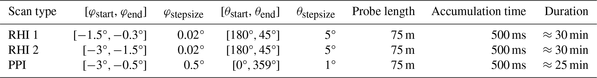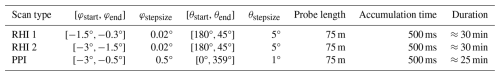 The settings used for the measurements were as follows (see Table 1): two sequences of SSLs were carried out using the RHI method (see Fig. 2a). The RHI scans of the first sequence (RHI 1) ranged from a start elevation angle of φstart −1.5° to an end elevation angle of φend −0.3°, and the second sequence (RHI 2) ranged from −3 to −1.5°, both with a step size of 0.02°. For one RHI measurement routine, a sequence of RHI scans was performed at discrete azimuth angles between 180 and 45°, with an azimuthal step size of 5°. The laser beams with azimuth angles outside this range were blocked by the tower. This sequence was followed by PPI scans (see Fig. 2b) with elevation angles of −3 to −0.5° in 0.5° steps. The resolution in the azimuth angle was 1°. A full run of the RHI routine required approximately 30 min. The six PPI scans used to perform a PPI-based SSL took approximately 25 min. During the observation period, this allowed for the acquisition of seven to eight complete SSL datasets per measurement configuration.