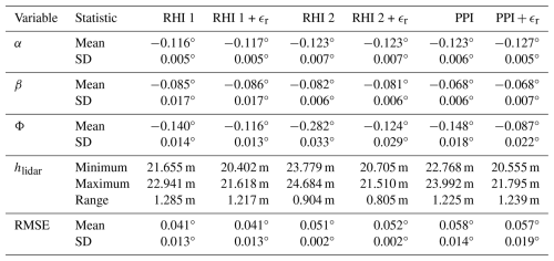 Table 2Mean values and standard deviation of the SSL parameters for RHI 1, RHI 2, and PPI (α, β, Φ, hlidar, and RMSE) over the measurement period from 19 November 2023 at 22:00 UTC to 20 November 2023 at 08:00 UTC. Because hlidar cannot be assumed to be a constant value due to the tide, the minimum and maximum, as well as the maximum difference, in the period are shown here. The SSL results are also shown with an rw correction of m.