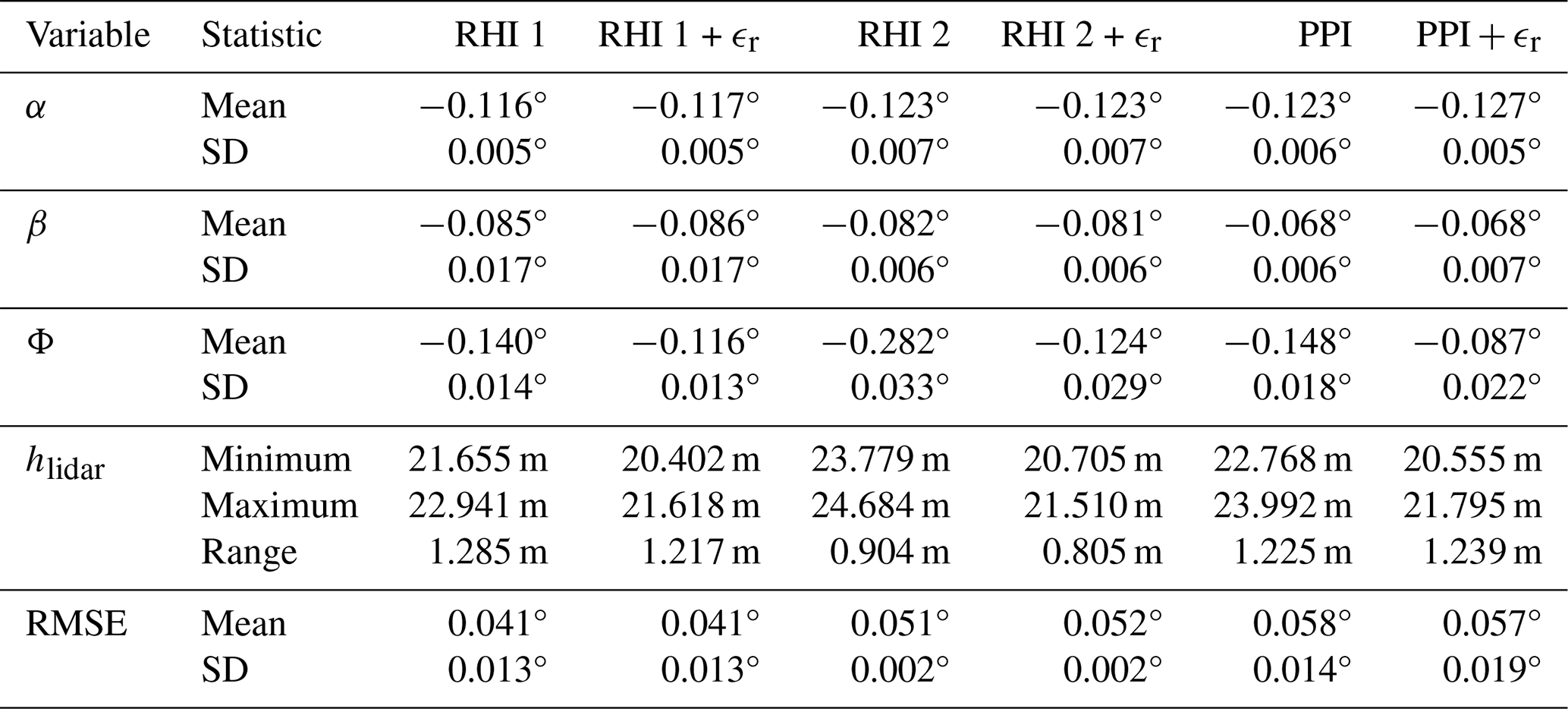 The third panel in Fig. 11 presents the elevation offset, a constant parameter of the measuring device that should remain unchanged over time, even in the presence of platform-induced tilts. The time averages of Φ differ notably between configurations: −0.140° for RHI 1, −0.282° for RHI 2, and −0.148° for PPI, with a maximum difference of 0.127° (see also Table 2). The standard deviations over time for each setting are also larger compared to the pitch and roll standard deviation. This variability could be explained by the fact that, as evident from the preceding analyses, Φ is particularly sensitive to errors, such as those arising from inaccurate rw measurements (see Sect. 3.1.1 and 3.1.2).