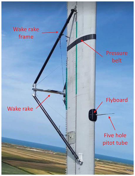 In this article, we present the measurements of local aerodynamic sectional characteristics on a full-scale rotor blade with a novel add-on instrumentation comprising a wake rake, a pressure belt, and a five-hole Pitot tube. In general, the demonstration of this instrumentation opens a range of promising new options for optimizing airfoil sectional performance in its real operating environment, e.g., the size and position of vortex generators.